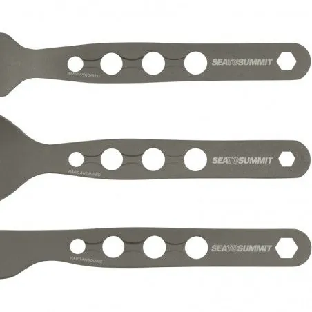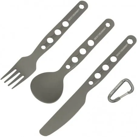 Avec leur construction ultra légère de qualité, leur manche percé de plusieurs trous pour économiser quelques grammes supplémentaires ou les attacher plus facilement ensemble si besoin, les couverts Sea to Summit Alpha Set ont tous les ingrédients essentiels pour la randonnée, le bivouac et le trekking. Et c’est un kit de couverts complet : on a une vraie fourchette (longueur : 16 cm), une vraie cuillère (longueur : 16 cm) et un vrai couteau (longueur : 18 cm) qui coupe efficacement + un mousqueton.